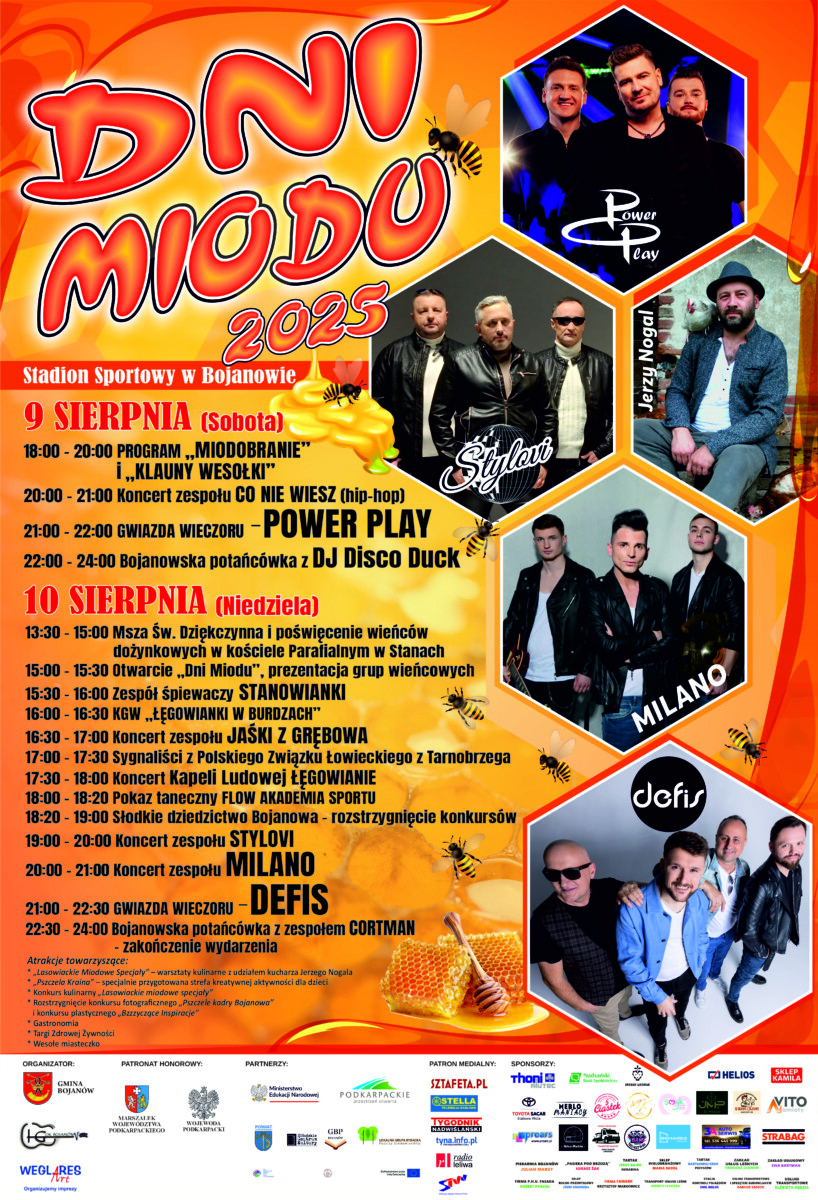 Gminny Ośrodek Kultury w Bojanowie oraz Stowarzyszenie „Lasowiacka Grupa Działania” zapraszają do udziału w wydarzeniu „Dni Miodu 2025”, które odbędą się w dniach 9-10 sierpnia 2025 roku na terenie Stadionu Sportowego w Bojanowie